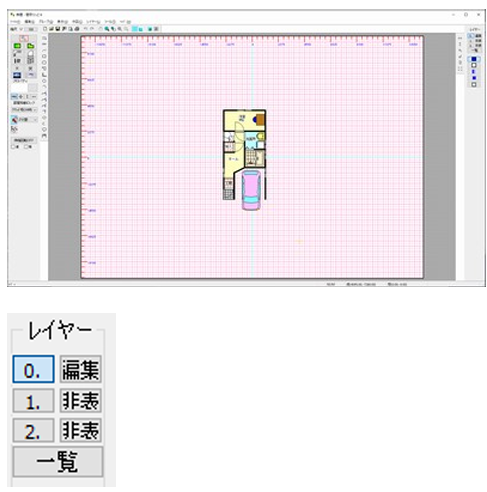 レイヤー1が「編集中」になり、レイヤー0が「表吸」になりました。「表吸」とは「表示吸着」の略で、表示して、吸着(線吸着の対象となる)もするということです。ベランダのところにレイヤー1の車の絵が見えます。