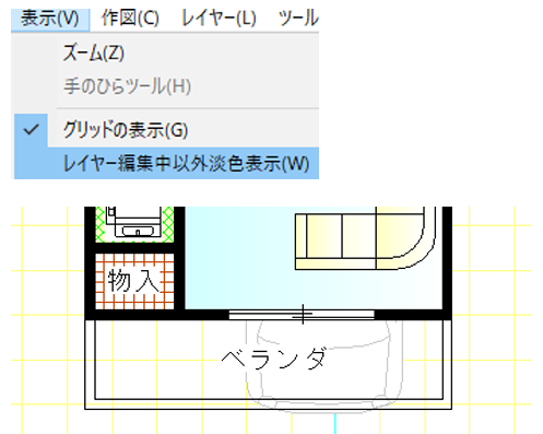 どこの部分がレイヤー0で、どこがレイヤー1かわかりにくくなるので、編集中以外のレイヤーを灰色で表示させられます。「表示」「レイヤー編集中以外淡色表示」にチェックを入れます。