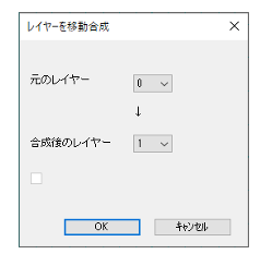 メニューの「ツール」の「レイヤー」の「レイヤーの移動合成」を選びます(「レイヤーのコピー合成」を選ぶと、元のレイヤーのオブジェクトも残したままになります)。元のレイヤーを0、合成後のレイヤーを1 にしてください。