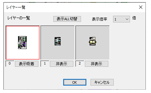 3つのレイヤーが一覧で表示されます。0には1Fの平面図が、1には2F、2には3Fが作成されています。上部の「表示倍率」は一覧が見づらい場合にあげてください。