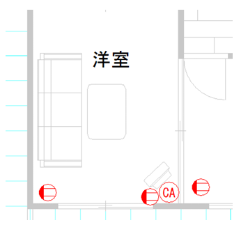 の両方を赤色に変えると、間取りの色はそのままで電気部品のあるレイヤー全部が赤色に変わります。