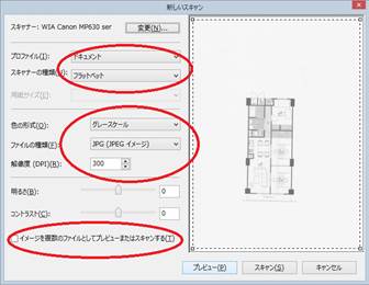 「プレビュー」を行なって確認後に「スキャン」で取り込みます。