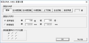 部品の向き・大きさとは、部品配置する時にあらかじめ向きや倍率を指定できます。また、部品配置する時のマウスの先の部品の位置を変更できます。左下のマスをクリックしておくと、部品の左下にマウスがくるようになります。あらかじめ配置位置がわかっている場合などは、これで変更してから配置すると便利です。