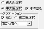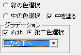 「中を塗る」で、「中の色選択」でグラデーションの第一色、「第二色選択」の色が第二色となります。 下のリストで方向を設定します。「左から右へ」で左の第一色から右の第二色へグラデーションします。第二色のデフォルト色は白色です。