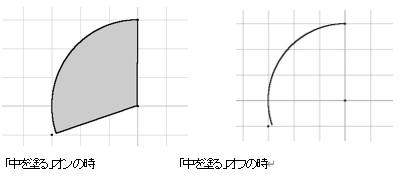 「中を塗る」がオンの場合は、円弧の半径ラインに線が付きます。オフの場合は円弧のみの図形となります。