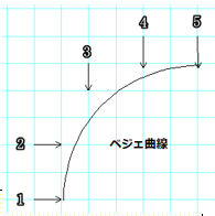「作図」→「曲線」→「ベジェ曲線」、もしくはアイコン をクリックします。 プロパティは直線と同じです。3点以上の点を指定し、ダブルクリックで終点を決めます。 スプライン曲線と違う点は、最初と最後の点以外通らないなめらかな曲線ができます。曲線は連続線になっています。