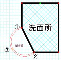 曲線にしたい部分の壁の頂点を1,2点左クリックします。3点目で曲線の弧の大きさを決めます。3点目が決めにくいときは、グリッド吸着間隔を細かくするか、グリッド吸着をOFF にしてください。