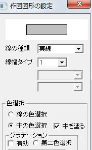 黒の時と同じように、「作図」「四角形」で、下記のように「中を塗る」にチェックを入れて、 グレーを選びますが、「グラデーション」の有効のチェックをはずしておきます(グラデーション表示時に柱部分にグラデーションをかけないため)。(すでに黒の柱を設置している場合は、選択して右クリックから「選択物のプロパティ」で色が変えられます)